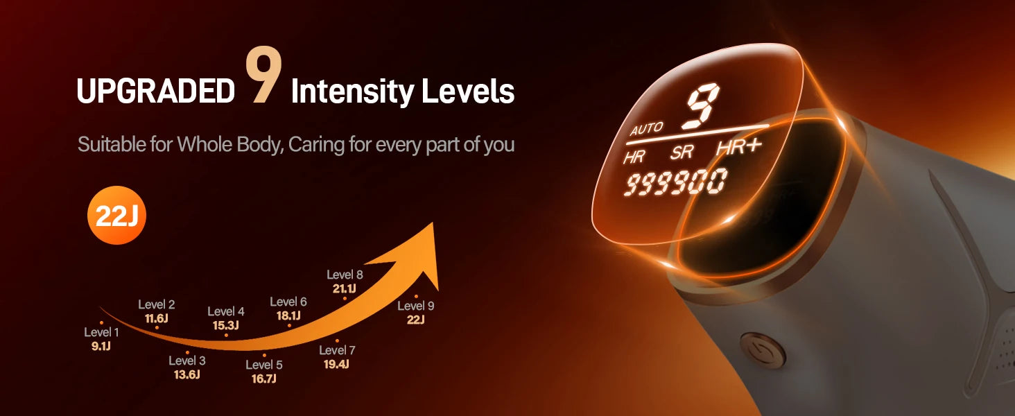 ● Adjust the intensity according to individual hair removal needs. 9-speed adjustment, easy to deal with all parts of the body, adapt to a variety of hair and skin color, and can adjust the gear according to different parts of the body, easy to use multiple parts of the body.
